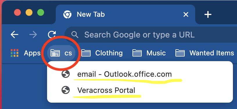 While in Google Chrome, click on the small yellow folder called “cs” in your bookmarks bar near the top (if you don’t see a bookmarks bar then hold down “Shift “Command” and “B” to make it visible). This folder has two links: one for accessing your email online (outlook.office.com), and one for accessing your Veracross portal.