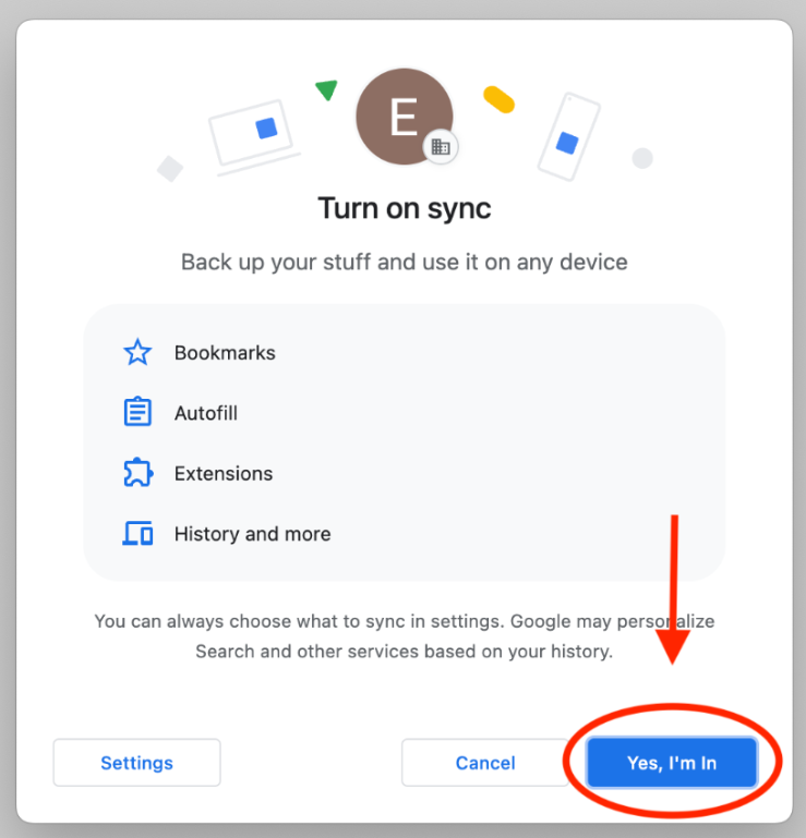Chrome will prompt you with the above dialogue box, asking if you would like to link your Chrome data to this account. Click ‘Yes, I’m In’ – this is imperative for your laptop to get the policies we assign to our Cushman devices.