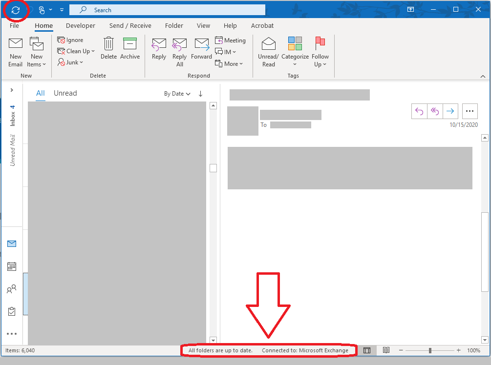 1. Check your server and Wi-Fi connectivity: At the bottom right corner of the Outlook App, make sure it says All folders are up to date. Connected to: Microsoft Exchange. If your email is not connected to Microsoft Exchange, then it will say Needs Password. In that case, click on that message and type your password. Refresh the app by clicking on the refresh icon located at the top left corner. Please refer to the image below: